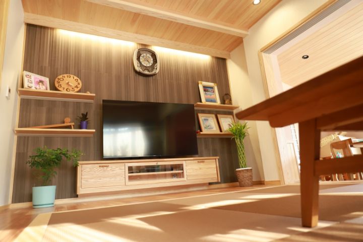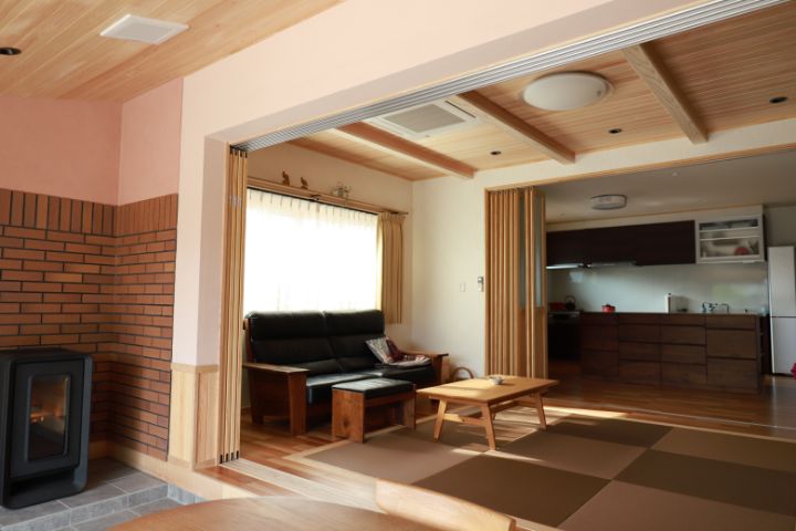 見たこともない新しい土間スタイルの空間で、靴を履いたままでくつ ろぐことができるスペースには薪ストーブがあり、冬でも暖かくてお 日様の明かりが照らし、キッチンと土間の間にはゆったりとしたリビ ングがあります。夫はここでソファーにすわって大画面のテレビを見 たり、本を読んだりしてリラックスしています。