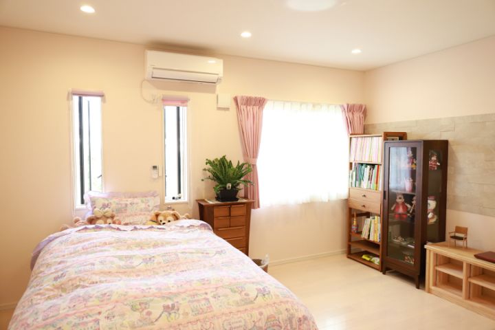 寝室は西洋風のリゾートホテルのようなデザインにしてもらいました。 白とピンクを基調としたやわらかな色調の空間で、夜は静かに眠ること ができて、朝は窓からの温かい光で気持ちよく起きることができます。