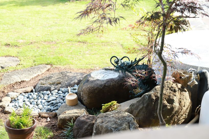 こちらには「水琴窟(すいきんくつ)」という日本庭園によく採用されるの装飾で、地中を掘った空洞の中に水滴を落下させ、その際に発せられる音を反響させる仕掛けが仕掛けられています。その水滴の滴る水音がまるで琴のようであることから、水琴窟と呼ばれています。