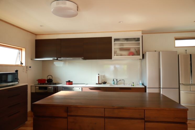 料理がだいすきなので、広々としたキッチンはぜひ欲しかったです。 キッチンとリビングの動線がシンプルで、会話と笑顔が絶えない空間 にすることができました。