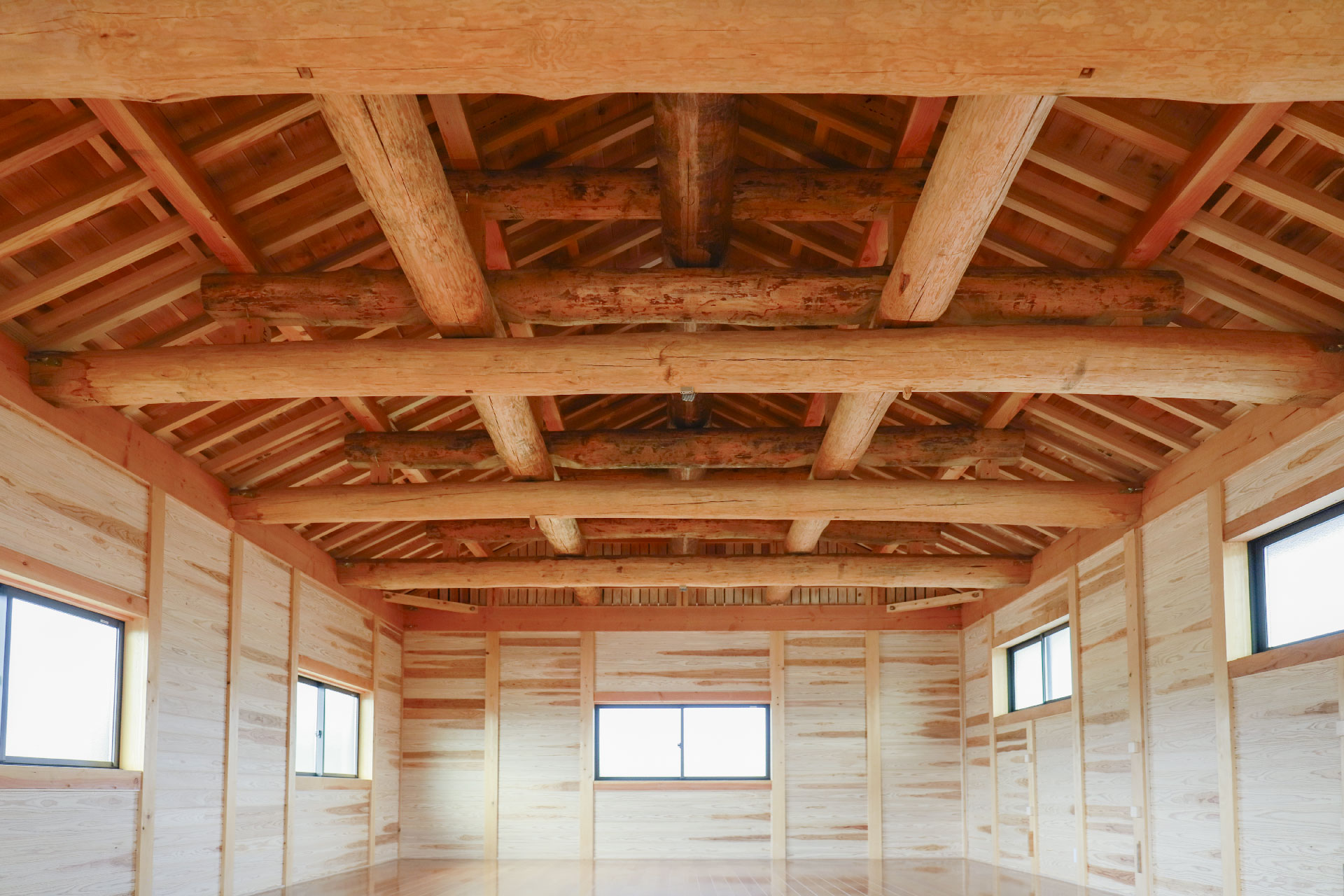 マルチな利用ができるようにあえて仕切りを作らず見上げれば丸太の豪快な天井を楽しめるよう設計しています。